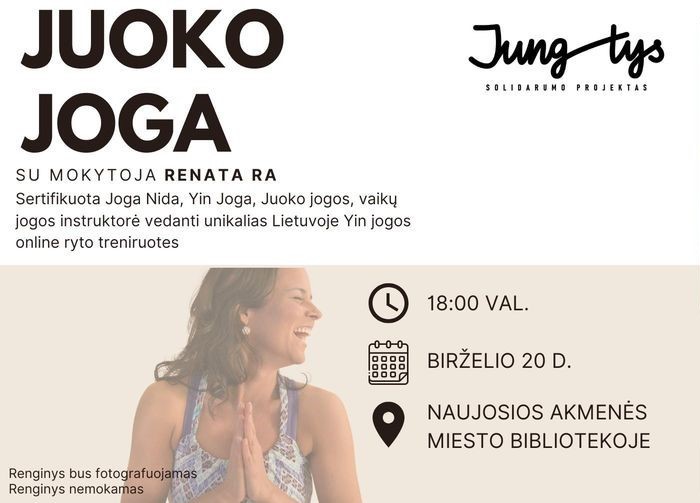 KADA? Birželio 20 d., 18:00 val.KUR? Akmenės rajono savivaldybės viešojoje bibliotekoje (V. Kudirkos g. 9, Naujoji Akmenė), esant geram orui juoko joga vyks lauke prie bibliotekos.