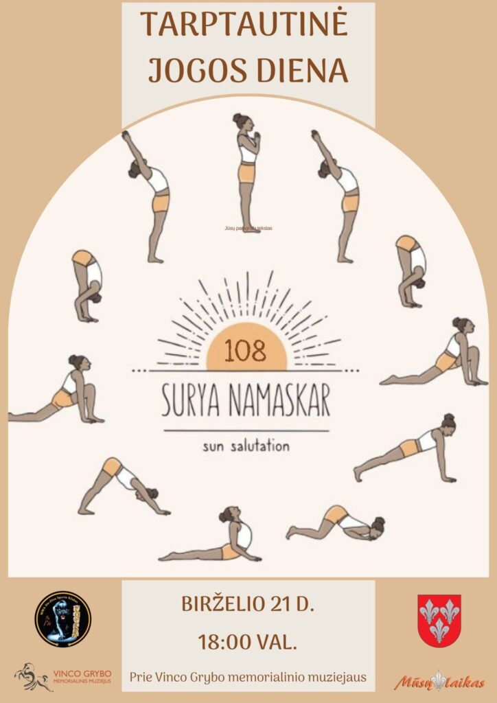 Kviečiame visus, kurie neabejingi aktyviam gyvenimo būdui, išbandyti savo jėgas ir ištvermę. Visi kartu, sujungdami devynis skirtingus judesius, bandysim atlikti 108 „saulės pasveikinimus“. Pasirūpinsime motyvuojančia muzika ir gera nuotaika. Niekas neliks be dovanų, o ištvermingiausių lauks specialūs prizai! Jurbarkieti, ar pasiryši iššūkiui „108“?! Renginys NEMOKAMAS!